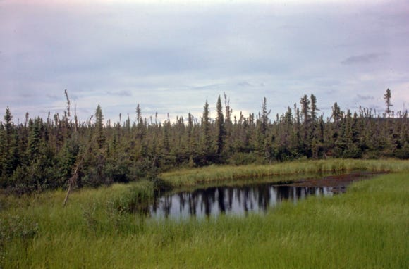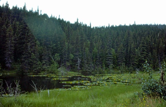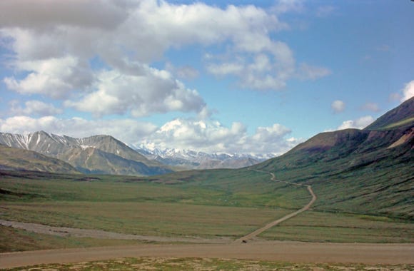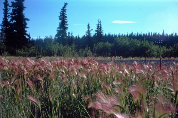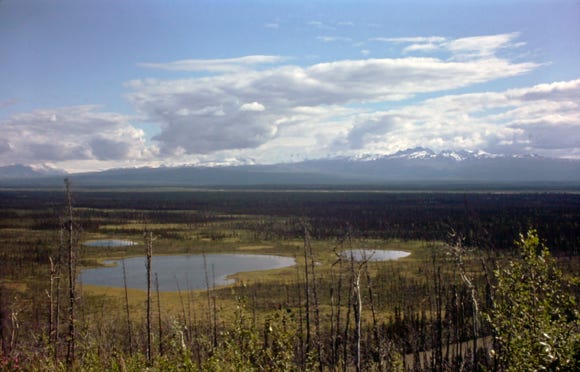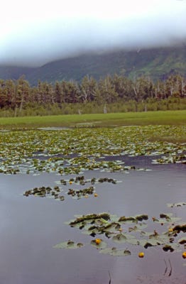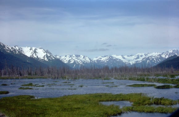The scenery is very spectacular with meadows, marshes, cotton puffs in the wind, pink plumes of wheat grass, lily pads, and fireweed. In this photo, you can see the Alaskan pipeline that parallels the highway to Valdez. Photos of Willow Lake and the Wrangle Mountains at MP 88.