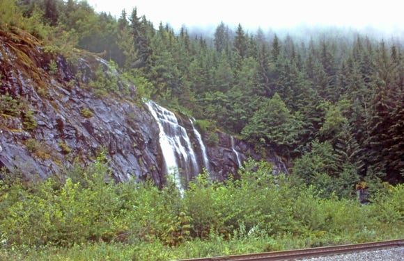 We are camping along the Skeena River, and the next day drive past waterfalls along the highway. The Kwinitsa Railroad station is on the Canadian National Railway mainline in Kwinitsa, British Columbia on the north side of the Skeena River across from the Yellowhead Highway 1.