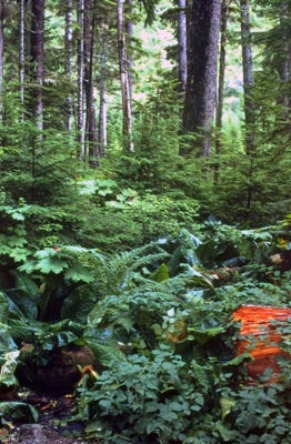 A photo of Bill and Lady at Exchamsiks River Provincial Park with the Sitka spruce rainforest that towers over the park on the Yellowhead Highway at MP 137.