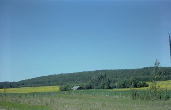 We arrived at Pine River just 20 miles before Chetwynd, B.C, and Bill caught a nice one-pound Dolly Varden often mistaken for a trout; this is a char. We spent the night here and the next morning we passed a farmhouse and a field of yellow flowers. We arrived at Dawson Creek at the start of the Alcan Highway and drove to Charlie Lake and spent the night at the campground.