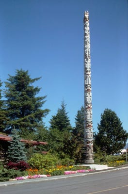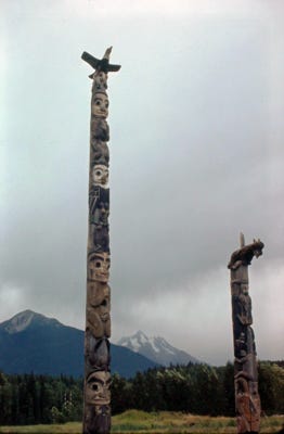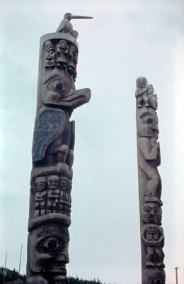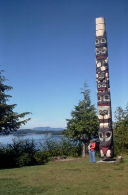 We arrived at Terrace and had to do some motor work on the Lazy Daze. During our trip, it was backfiring at times, either because of water in the gas or the carburetor. We arrived at Prince Rupert on August 8th at Port Edward and took more photos of totems in the area and the surrounding homes.