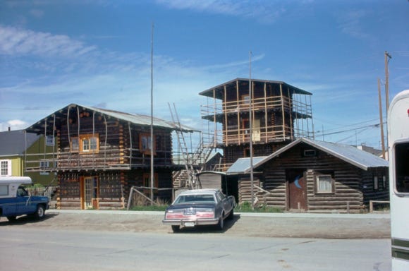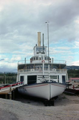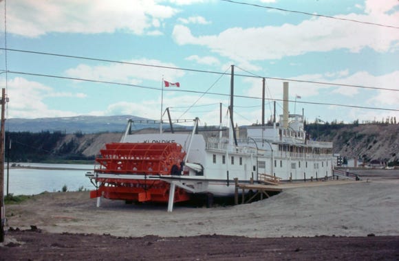 Photos of the SS Klondike, one of two stern wheelers that were moved through the streets of Whitehorse in 1968 to its present site. These were used to move freight between Whitehorse and Dawson City on the Yukon River. In Whitehorse are the Log Skyscrapers, built-in 1947 to provide housing for the construction workers for the Alaska Highway, the North West Staging Route Airports, and the Canol Pipeline.
