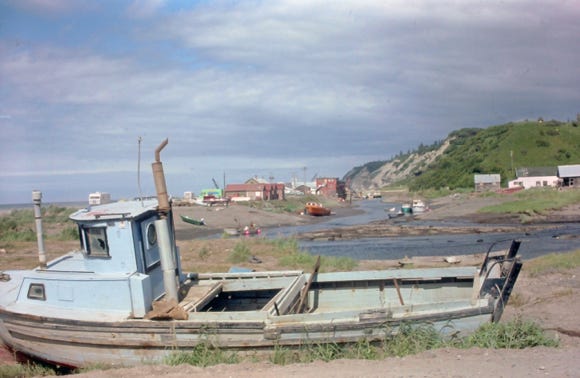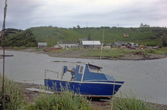The town’s picturesque Russian Orthodox chapel is a highlight of the area. Photos of the boat harbor and containers full of salmon. Deep Creek and salmon spawn at the inlet of Deep Creek.
