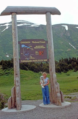 The next morning we left for Steward; it was cloudy with rain most of the day. We pass the Explorer Glacier on our way to Steward, Nancy, and Lady are standing under the Turnagain Pass sign with an elevation of 988 feet with an average of 12 feet of snow a year.