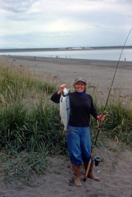 We stayed at a campground in Soldotna and Bill was fishing on the Kenai River by Spruce Street Road and used a jig and caught this nice 8-pound sockeye salmon and we lost three other fish that day. The next day Bill caught an 8-pound and 10-pound salmon that we traded in for canned salmon since our freezer was full of salmon and clams.