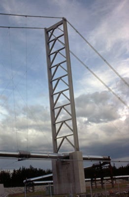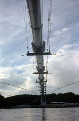 Views of the Alaskan pipeline crossing the Tanana River. The crude oil pipeline was built between 1975 and 1977 at a length of 800 miles going from Prudhoe Bay to Valdez Marine Terminal. The diameter of the pipe is 48 inches and has shipped over 17 billion barrels of oil since 2014. With many pumping stations, it creates a constant flow of oil at 4 miles per hour and would take nine days to arrive at Valdez.