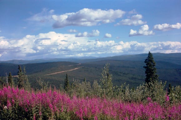 Leaving Whitehorse is a view of the mountains by Kusawa Lake at MP 958. At Champagne which is about 56 miles west of Whitehorse is an Indian village and a trading post. Driving along another long dirt road as we continue to Haines Junction in Yukon with a photo of fireweed along the side of the road.