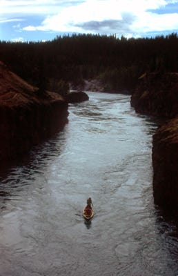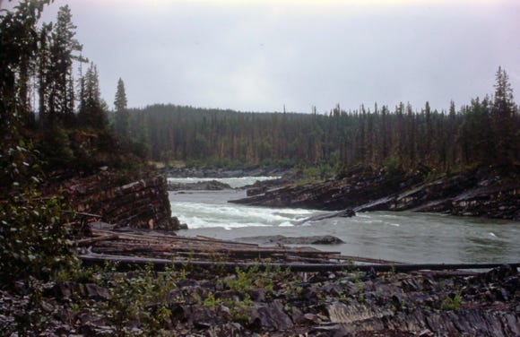 Leaving Watson Lake we continue to drive along another long area of dirt roads, and you can see by the back of the RV it is covered in mud. We stopped at the Yukon River, and Bill caught a nice grayling. This photo is of Miles Canyon, the headwaters of the Yukon River before we get to Whitehorse at MP 911.