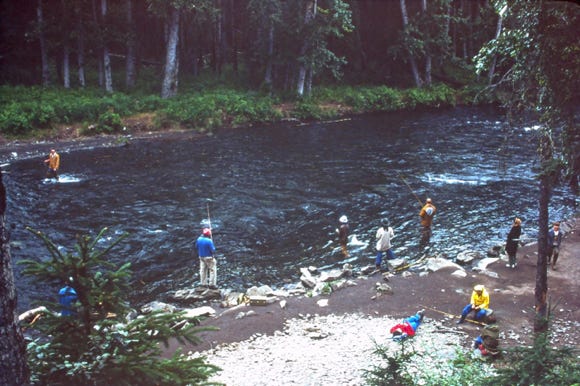 During the week of July, 4th there was a large salmon run going up the river for two weeks, the campground was full and people were parking on the main highway and hiking down to the river to catch salmon. The weekends are extremely crowded this time of the year. We hiked up to the falls area on the river and fishing was slow.