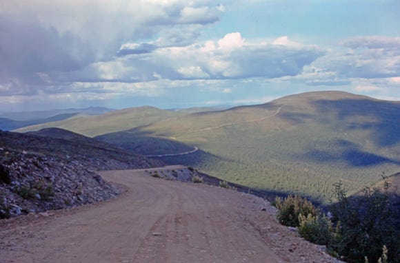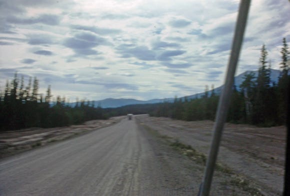 The next morning we are driving on Highway 3 (Taylor Highway) to “The Top Of The World,” also known as the “Skyline Drive.” This was a dirt road at the time of our trip to Dawson City. From Tok to Dawson City to Watson Lake were 1,200 miles of dirt roads.