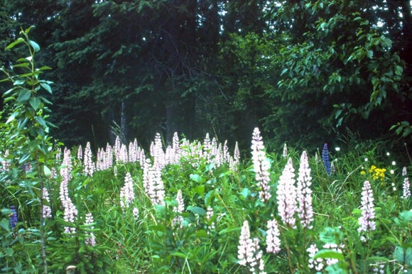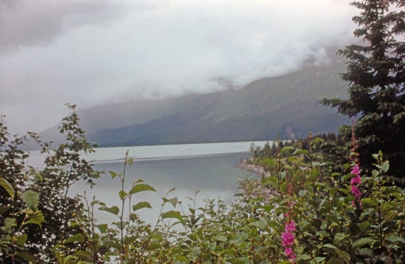 A view of Kenai Lake at MP 104 and rare pink albino lupines.