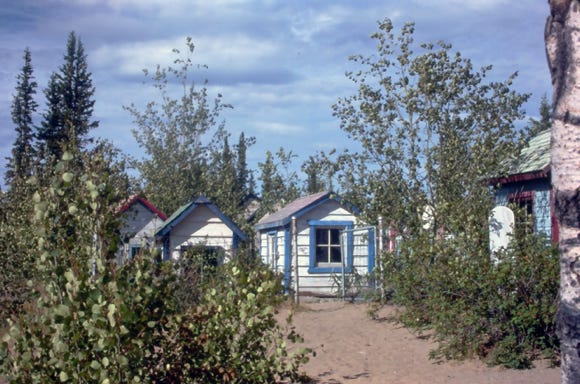 We took a boat trip on the river and got off to see the Indian village of “Moosehide,” and a photo of drying salmon and other fish. A church along the shoreline and a fishing wheel on the river. A photo of the paddle-wheeler graveyard and the SS Keno. The SS Keno was constructed in 1922 in Whitehorse and was the last paddle-wheeler to sail the Yukon River in 1960.