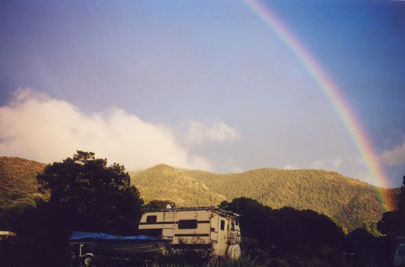 We drove the two loops to find a level site for our camper and boat. Since this was late in the afternoon many larger sites were already taken, but after driving the loops several times we settled in on a site and unhooked the boat. Then came trying to level the camper since the site was out of level. I got out all of our level blocks as Bill was telling me which side needed the most, after several tries, we finally got the camper level. One thing we said to each other was that we were glad that we did not have our 34-foot trailer with us since there were very few sites that could hold such a large unit. The restrictions for vehicle length are 32 feet, and turning the corners of the loops would be impossible if we had our trailer with us since our total length is over 60 feet. Before you enter the park, there is a private campground where you can park your large RV and then drive in with your tow vehicle or car.