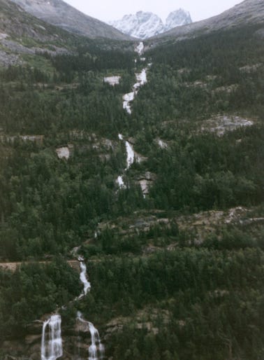 What a beautiful fall, this is called “Pitchfork Falls,” as it tumbles down the mountain from Goats Lake. Moose Creek Bridge spans a 110-foot wide gorge with Moose Creek at 180 feet below the span. At the time, it was built, the single-end support bridge was the only one of its kind in North America.