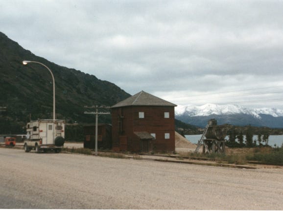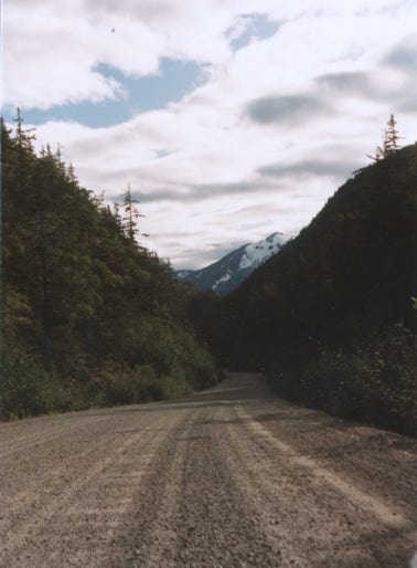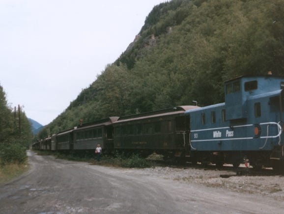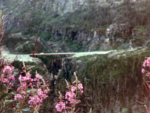 This is, of course, a dirt, and gravel road, something that we are familiar with since we drove the Alcan Highway years before. You can see by the photo on the East side of the canyon the remains of the old brackets wagon road below the track. This road was constructed in 1897 and served as a toll road from Skagway to White Pass City.