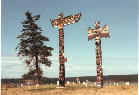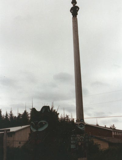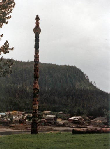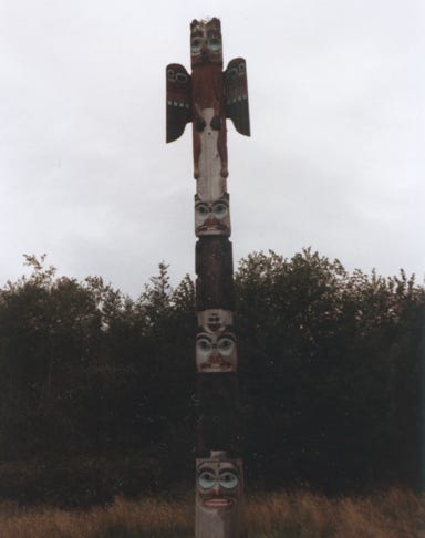 A large totem pole on Stakes Island.