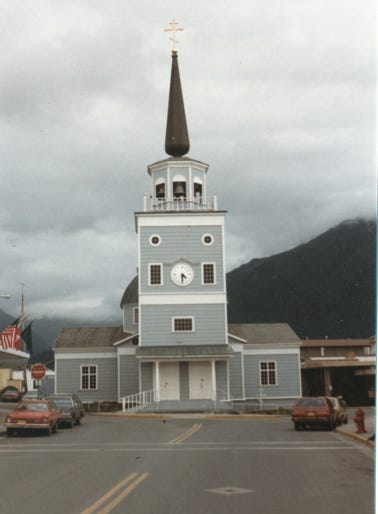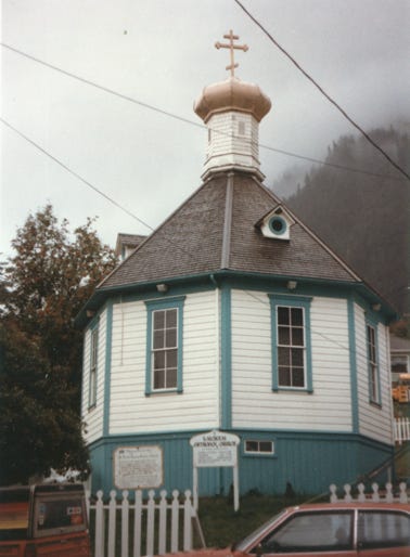 This is downtown Sitka, and St. Michael Cathedral National Historic Landmark built from 1844 to 1848 by Bishop Innocent Veniaminov on Lincoln Street. Home of priceless original icons and paintings of the Czarist days.