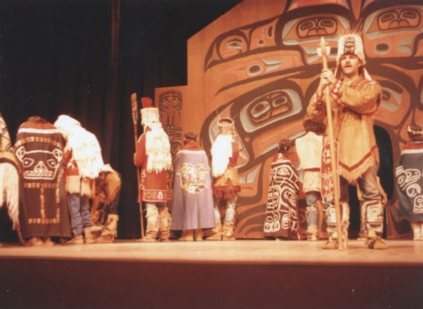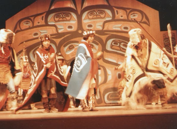 Another dance called “Ptarmigan Dance,” is performed by the group. They use many priceless artifacts, including several Chilkat blankets in all of their performances. A photo of the “Haida Blanket Dance.”