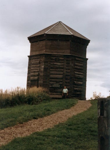 Bill standing in front of the Russian Blockhouse. This stout structure is a re-creation of the guard tower that once stood here, part of the fortress enclosing the Russians during their time in Sitka, from 1804 to 1867. Fearful of the wilderness around them, and Tlingit Natives, the Russians’ enclosed fort was open to outsiders only in the daytime. A massive fence, with three guard towers like this block tower, separated the fort from the rest of Baranof Island. The tower is closed, but you can get a feel for the Russian fortification and mindset with a visit here.