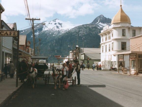 A view of downtown Skagway, the snow-capped mountains, and the Golden North Hotel, Alaska’s oldest operating hotel, built in 1897. It features original 1900’s furnishings.
