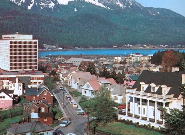 This is a postcard view of downtown Juneau with the Governor’s mansion in the foreground; the mansion was constructed in 1910. You will see St. Nicholas Russian Orthodox Church which was constructed in 1894, this octagonally-shaped building is the oldest Russian Church in Southeast Alaska. Inside they show Russian icons, vestments, and old religious books.