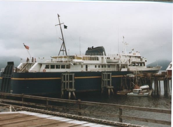 The M.V. Le Conte at Tenakee Springs, the length of the ship is 235 feet and carries 250 passengers and 47 vehicles.