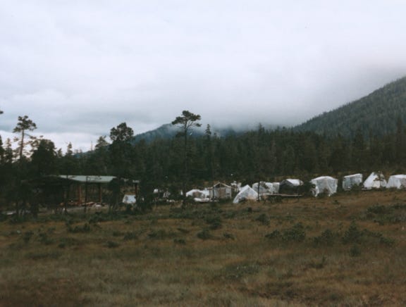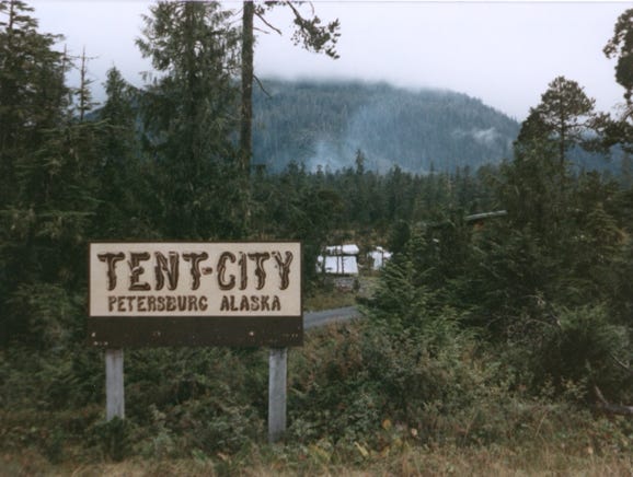 Here, we are at “Tent City,” a camping facility accommodating 150 people, primarily young summer cannery workers. Wooden tent platforms and boardwalks are provided to keep the campers off the muskeg. You can see many plastic tarps to protect the tents “underneath,” from all of the rain.