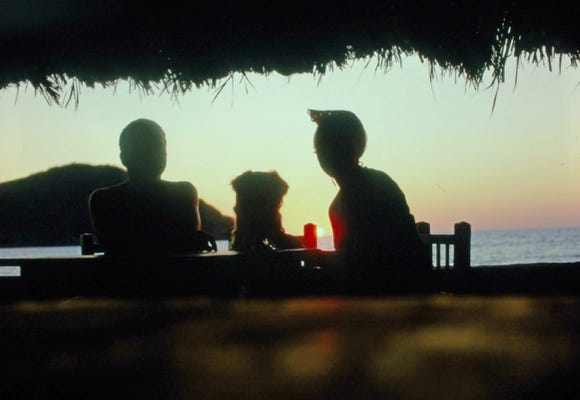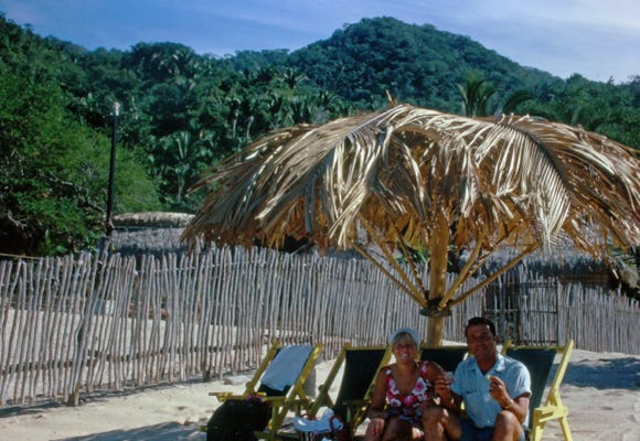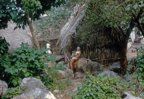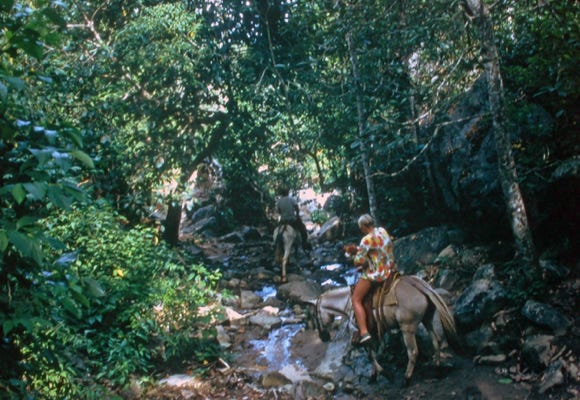 The three of us sitting under a Palapa enjoying some moonshine called “Raicilla,” made from the maguey plant is 100 proof. We took a burro and rode up along the El Tuito River to see two impressive waterfalls and took a swim. Nancy kept Lady straddled on the saddle as Bill was taking pictures. We passed a small home where a woman was making corn tortillas by hand, and we ate several of them.