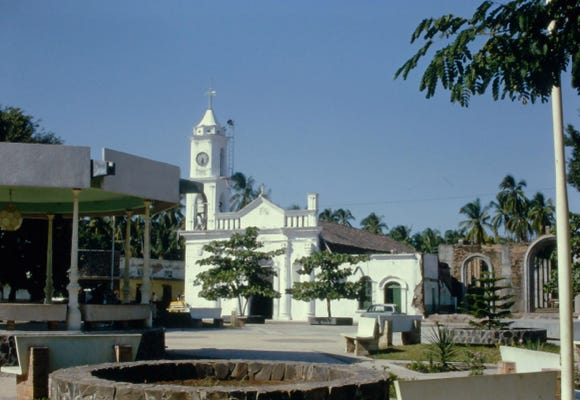Leaving Mazatlan on Highway 15 a photo of a church in Mazatlan, and a village called San Miguel. We are driving south to the quaint town of San Blas. Along the way is a green shrine, an old Alamo, and a church. Another village along the San Cristobal River and to the plaza at San Blas.