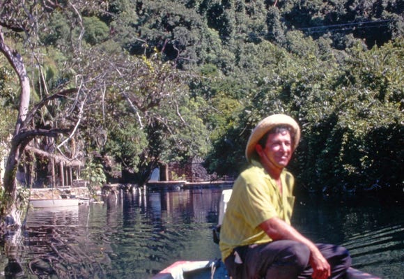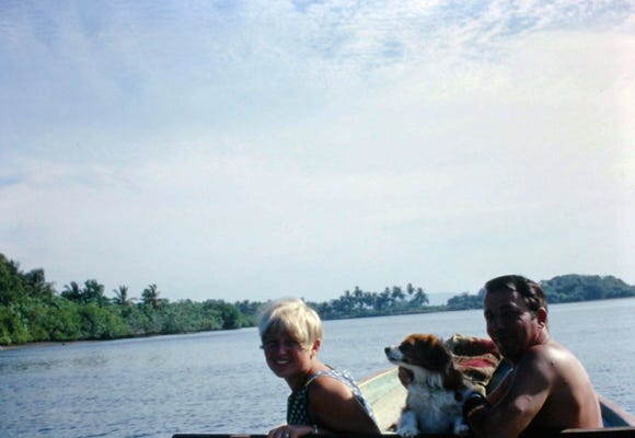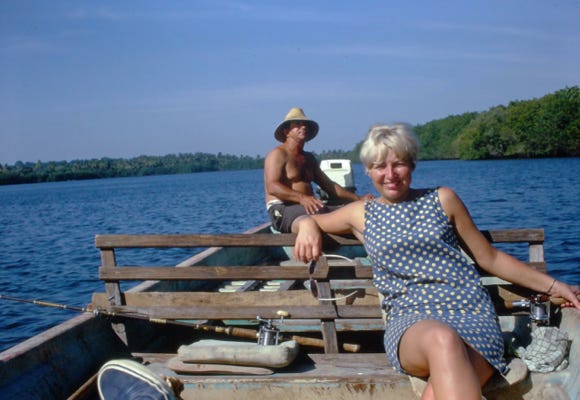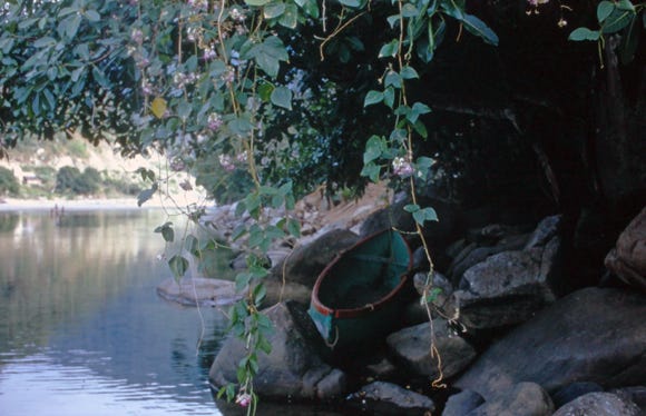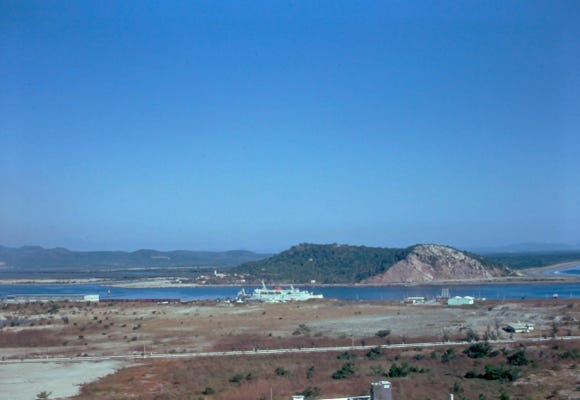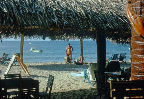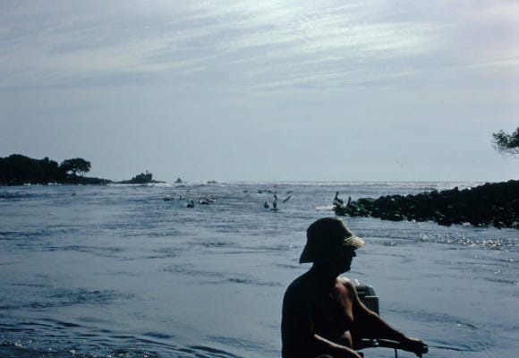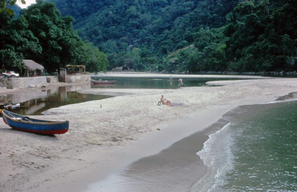 At that time the road was a dirt road and we had to forge a stream to get to Boca. A view from the road of Boca de Tomatlan and our dune buggy with Lady and Nancy. Several views of the bay and wild orchards. We brought our lunch and while Bill was fishing for bonefish, Nancy and Lady were relaxing on the sand spit. Bill had luck and caught a nice bonefish.