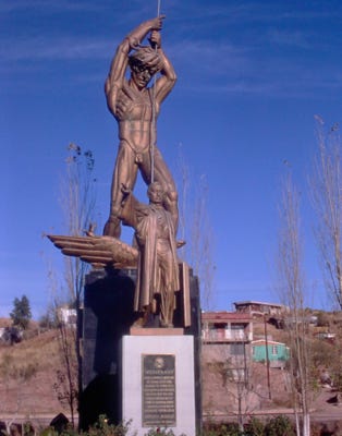 Entering Nogales we took a photo of the famous statue “Mono Bichi” killing an eagle, then driving along Highway 15 south to Hermosillo we passed by some young boys with their burro, and a group of kids selling their red peppers. This is the church of Santa Maria Magdalena in Magdalena de Kino, a cemetery before the town of Santa Ana, and then to the town of Hermosillo.