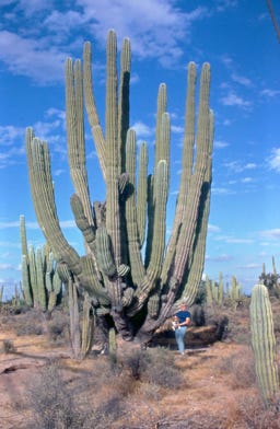 Driving along the highway, we approach some of the largest Saguaro Cactus that we have ever seen that can grow to 45 feet high. You can see how small Nancy and Lady are standing next to this large cactus. Now driving along the coast we are approaching Kino Bay, you will see some homes along the shoreline where Americans and others have built their homes. At that time you could park along the shoreline to camp without any restrictions.