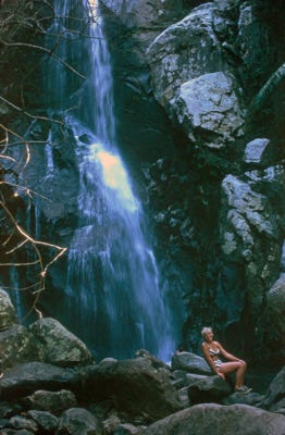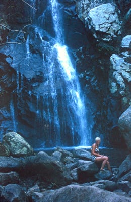 At the waterfalls, Nancy and Bill enjoyed the cool water while Lady sat under some shade, we were the only ones at the waterfall, now it is a very popular area crowded with many tourists.