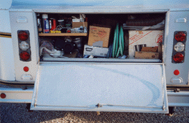 Also, in the cabinet is a 40-channel CB, 600-watt Heart Interface Inverter, space for a Satellite Receiver with all cables for the TV, VCR, AM/FM Stereo System, a Weingard Antenna with a 12-volt booster, two 12-volt fans to cool all the components in the TV cabinet. We also have two stereo speakers for listening to music when sitting outside controlled by a 3-way switch mounted in an inside cabinet.