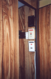 We have five Arco Solar panels mounted on the roof that are adjustable for tilting towards the sun along with a controller unit that shows amps of charge and battery voltage. Mounted outside on the air conditioner housing is a yellow 12-volt strobe lite that goes on when the burglar alarm goes on. The burglar alarm controls are mounted in the same cabinet along with the solar panel controller. The alarm system is wired to every outside compartment door as well as the front door and the screen door insert, the two battery boxes are also wired to the alarm system to protect the batteries. We also have a separate switch that you can pull from inside the trailer to make the alarm go off on its own to scare away intruders. Also, in the living room, you can select a wall switch to put on scare lights that light up all around the trailer at nighttime.