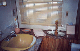 From the bedroom area is the large rear bathroom with double wardrobe closets, a large tub, and a shower. The bathroom sink is very large with two drawers and a compartment for more storage. We have installed a new Sealand China Bowl Toilet with a hand sprayer, and have replaced the 6-gallon water heater that is glass-lined.