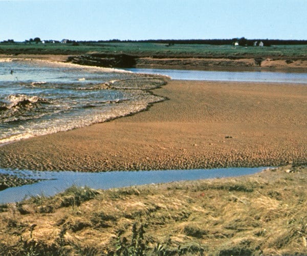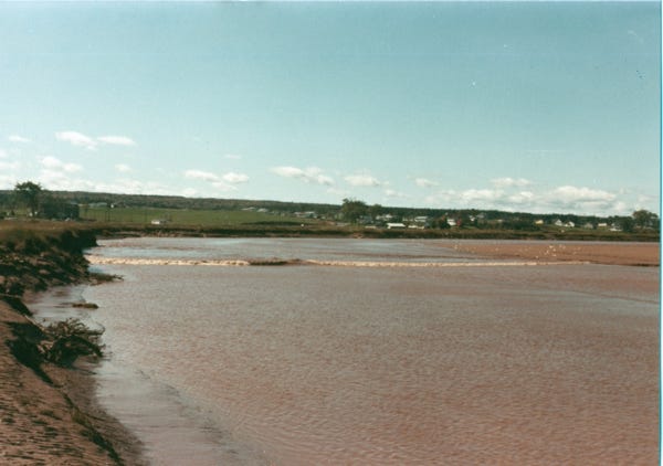 The tidal range in the bay is 43 feet, it is the world’s highest tides that cause this tidal bore. There are two high and two low tides each day, and you can see from the photo a wave crossing in the background.