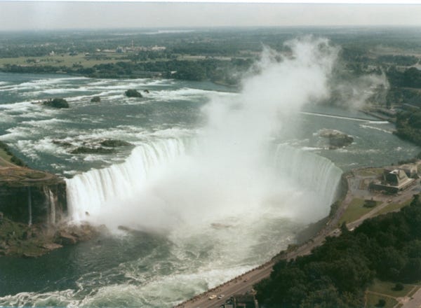 This is an aerial view of the Canadian Horseshoe Falls and American Falls which are situated 20 miles from Lake Erie and 14 miles from Lake Ontario.