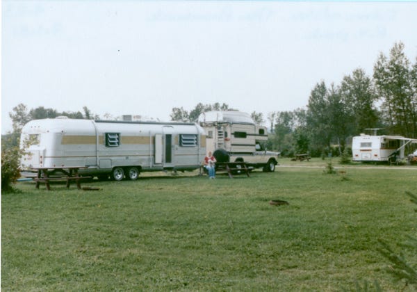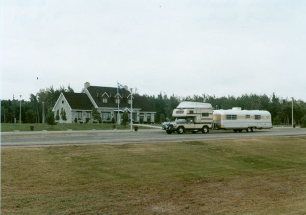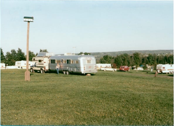 Bill and I again in front of the trailer at Mactaquac Provincial Park, located North of Fredericton, it has an 18-hole golf course in the park. We played a round of golf here, and it was fun.