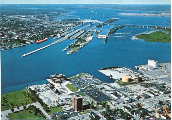 A postcard view of Sault Ste. Marie, and the famous Soo Locks, which provide a lift of 20 feet to bring a vessel from the St. Mary’s River to Lake Superior.