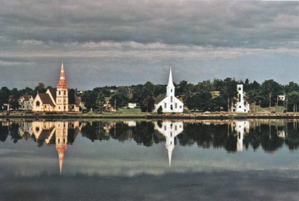 This is a postcard of “The Three Churches,” in picturesque Mahone Bay, in the City of Lunenburg. A coastal view near Yarmouth.