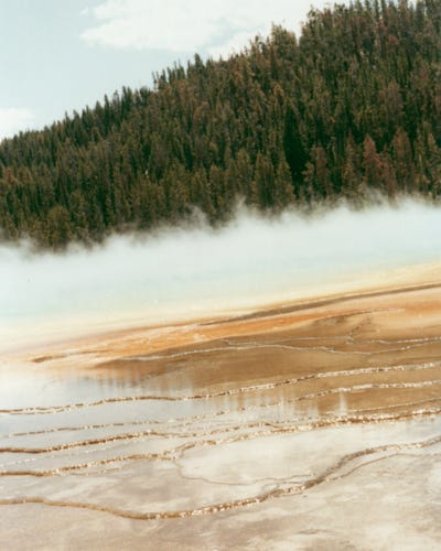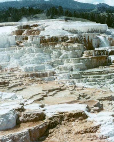 Bill is standing on a walkway with Mammoth Hot Springs in the background. With more, than 700,000 gallons of water and two tons of limestone pouring out each day as the tiers steadily grow.