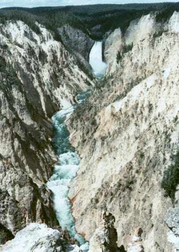 The Grand Canyon of the Yellowstone River. Lower falls cascade 308 feet, twice as high as Niagara Falls.