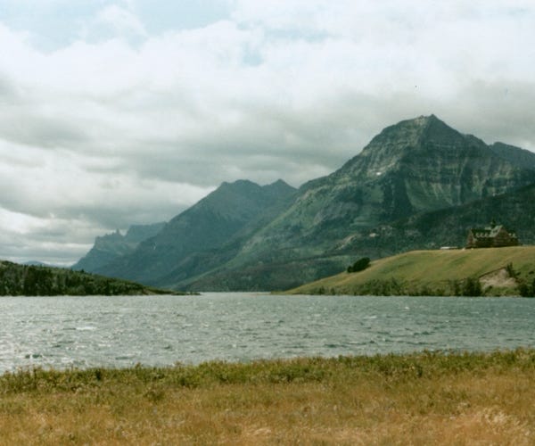 A view of Waterton Lakes National Park in Alberta, Canada, and the Prince of Wales Hotel.