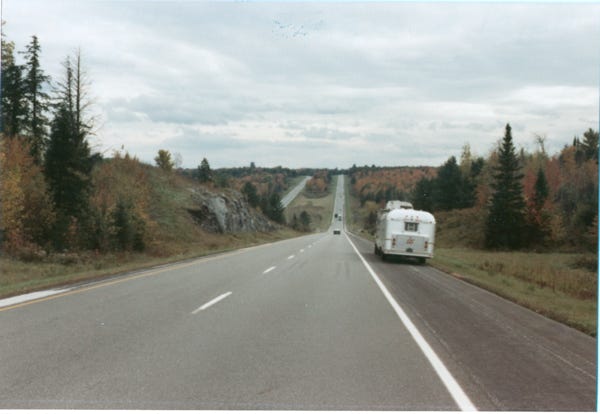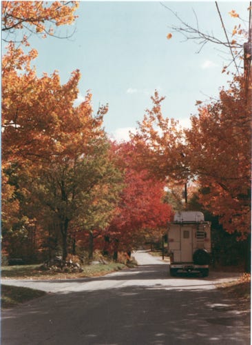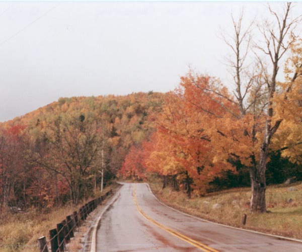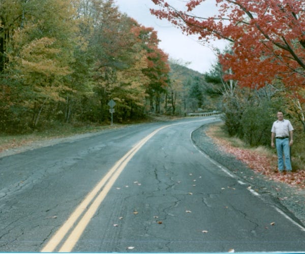 We are now on Highway 302, and 25 heading to Barre, Vermont, the trees still have fall colors. Bill standing along the two-lane road.