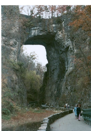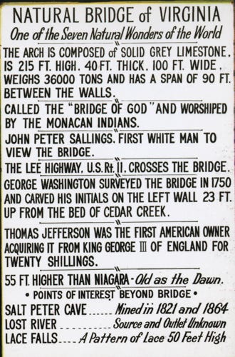 This is listed on the National Register of Historic Places; the 215-foot tall Natural Bridge is a limestone gorge carved out by Cedar Creek. The postcard has more information about the bridge. Another interesting fact is that George Washington climbed 23 feet up the southwest wall where he chilled his initials in 1750.
