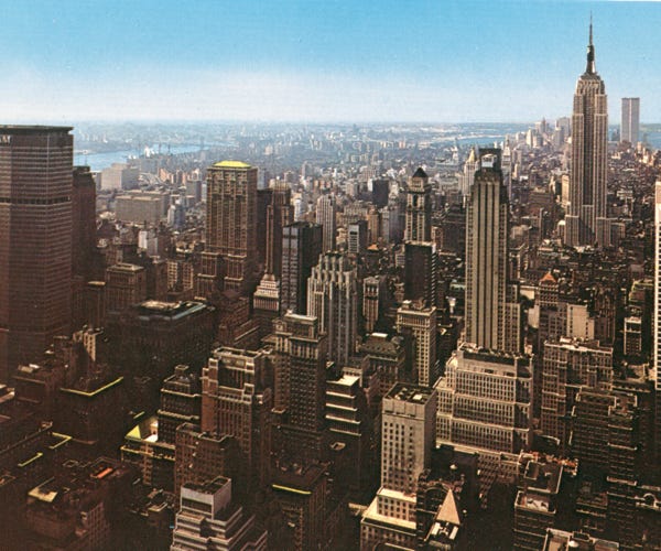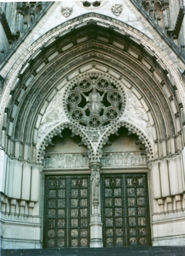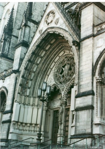 An aerial view of the New York Skyline, and a high-rise building with the twin towers in the background. We stopped and toured the “Cathedral of Saint John the Divine,” construction began around 1892. A postcard of the great rose in the West front takes its acknowledged place among the great windows of the world. It is 40 feet in diameter and contains over 10,000 pieces of glass.