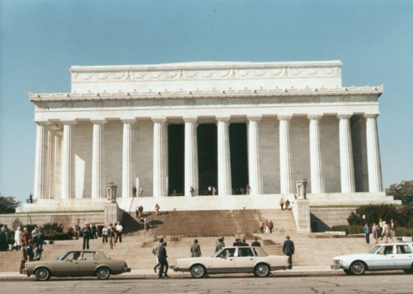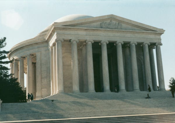A photo of the Lincoln Memorial, and President Lincoln, and another monument. The Jefferson Memorial was built between 1939 and 1943.