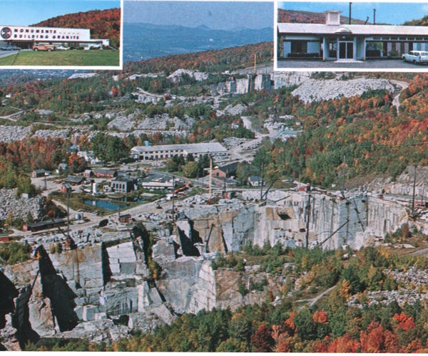 A postcard and several photos showing the “Rock Of Ages,” granite quarry. Barre is the self-proclaimed “Granite Center of the World” and is 4 miles long, 2 miles wide, and 10 miles deep.