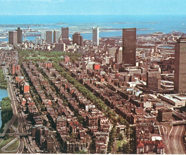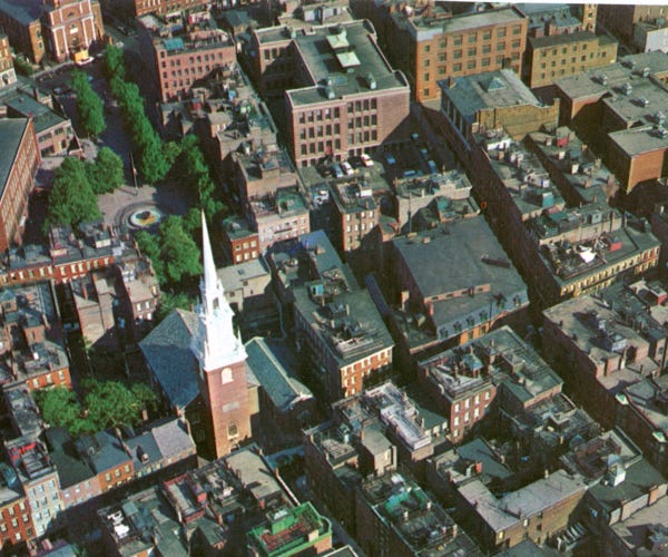 Here is a postcard of an aerial view of Boston, Massachusetts, and an aerial view of the “Old North Church.” Located on the Freedom Trail this historic church’s steeple was where the signal light was hung for Paul Revere’s famous midnight ride of April 18, 1775. The church still holds regular service each Sunday at 11:00 AM. North Church is the oldest church building in Boston built in 1723.